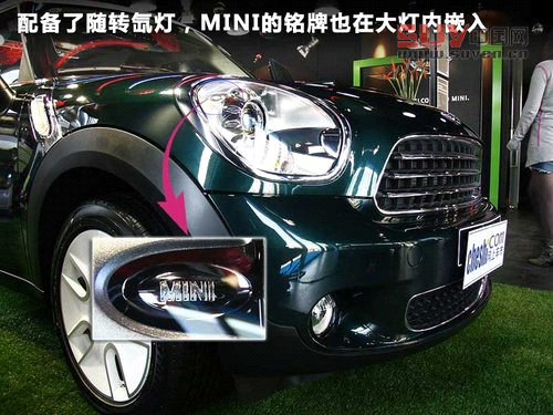 前大燈為氙燈設計,保證了亮度,隨轉系統的引入也提高了行車的安全。在大燈的外側還嵌有有MINI的銘牌。前進氣格柵的造型也頗顯野性,完全是格狀的進氣格柵,橫條部分進行了鍍鉻處理。