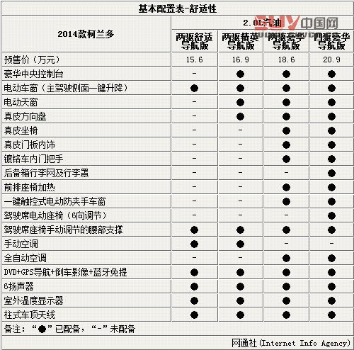 在舒適性配置方面,2014款柯蘭多全系均標配了6揚聲器、室外溫度顯示器、柱式車頂天線以及GPS導航和倒車影像。除此之外,豪華版車型配備了全自動空調,而低配版車型則配備的是手動空調,