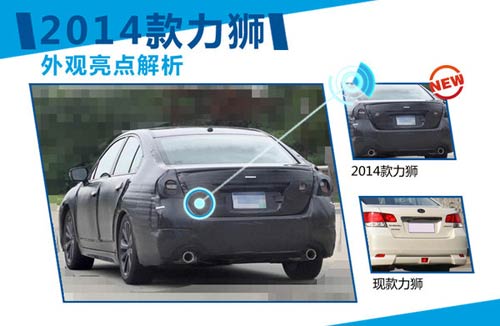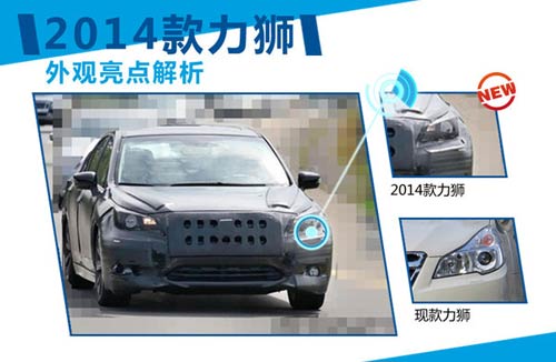 2014款力獅在外觀上較現款作出了一定的調整,新車取消了引擎蓋上方的進氣口設計,下進氣格柵也有所加寬,前大燈變得更加細長,后視鏡獨立于A柱之外;從新車尾部來看,尾燈采用全新設計,取消了現款車型的隱藏式排氣管,采用了雙側單出的尾排造型。