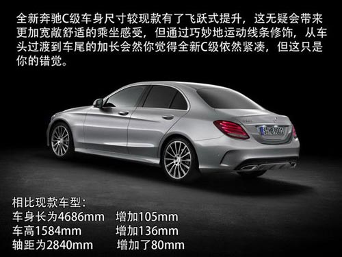 車身尺寸方面:新一代C級(jí)相比現(xiàn)款車型尺寸增加顯著,車身長(zhǎng)為4686mm(增加105mm)、車高1584mm(增加136mm),軸距為2840mm,相比現(xiàn)款車型增加了80mm。車身尺寸大幅的增加標(biāo)致著新一代C級(jí)將擁有充裕的車內(nèi)空間及乘坐舒適性。同時(shí),新一代C級(jí)還將車身輕量化進(jìn)一步優(yōu)化,C180重1395kg,C200重1445kg。