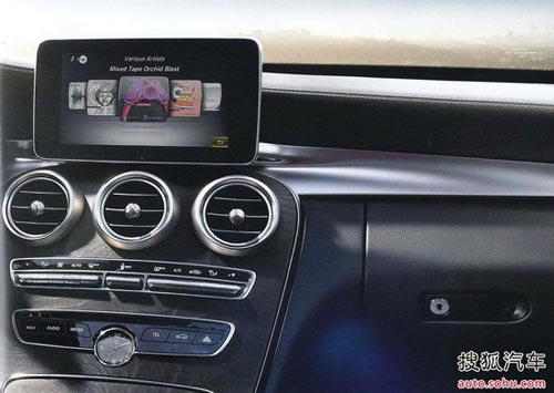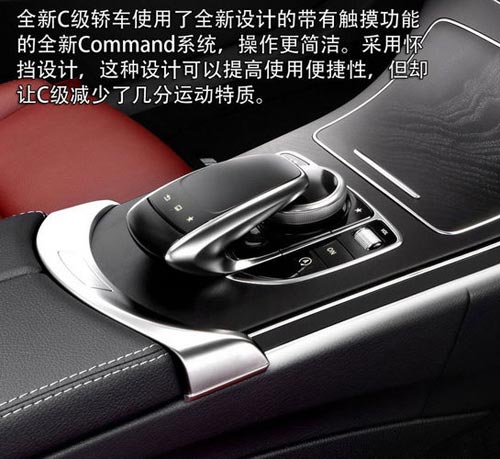 全新C級(jí)轎車使用了全新設(shè)計(jì)的帶有觸摸功能Command系統(tǒng),因此中控臺(tái)上的控制按鍵并不多,加之懷擋設(shè)計(jì)和未拋光的暗色調(diào)實(shí)木裝飾,整個(gè)中控臺(tái)顯得簡(jiǎn)潔又高檔。圓形的空調(diào)出風(fēng)口,配合紅色的座椅蒙皮、諸多閃爍著金屬光澤的鍍鉻件和三幅式方向盤(pán),非常具有運(yùn)動(dòng)氣息。