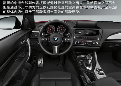 車輛內(nèi)部:翻折的中控臺(tái)和副儀表板區(qū)域通過(guò)特征線獨(dú)立出來(lái),雖然橫向空間不大,但是通過(guò)小尺寸的方向盤(pán)以及細(xì)化處理的空調(diào)和音響控制面板,寶馬2系的整體內(nèi)飾也賦予了駕駛者相當(dāng)寬敞的駕駛感受。而整體內(nèi)飾的包裹性也非常強(qiáng)烈。