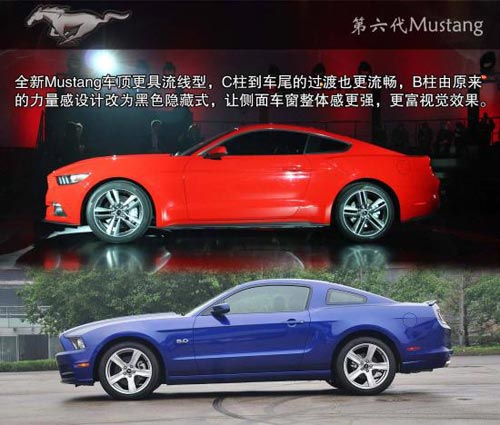 全新Mustang車頂更具流線型,C柱到車尾的過(guò)渡也更流暢,B柱由原來(lái)的力量感設(shè)計(jì)改為黑色隱藏式,讓側(cè)面車窗整體感更強(qiáng),更富視覺(jué)效果。