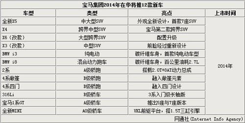中國市場已經成為了寶馬最重要的市場,其在今年相繼推出了3系GT、5系Li的中期改款等重磅車型,前三季度共計售出新車284,964萬輛,實現了同比20.2%的增長。寶馬集團大中華區總裁兼首席執行官安格先生表示:“今年前三季度的穩健增長為2013年實現銷量新高打下堅實基礎。這樣的業績驗證了我們在全業務鏈追求高質量發展戰略的成功?!痹诩磳⒌絹淼?014年馬年,寶馬還將在保持銷量穩定增長的同時推出多款全新車型,如全新X5、i3等。網通社匯總了寶馬集團2014年即將在華推出的12款新車,每款新車均有不同的亮點,下面我們就來帶領大家逐一預熱一下。