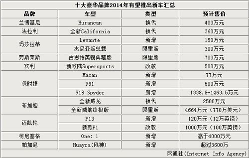 只有少數(shù)人能享受豪華車為用戶帶來的奢華“服務(wù)”,但卻會吸引很多普通人群的關(guān)注,也因此歷年各大超豪華廠商將推出的“豪車”則成為了眾人矚目的焦點。隨著2014年正式到來,包括蘭博基尼和法拉利等品牌均將對旗下產(chǎn)品進行更新,同時布加迪和柯尼塞格等品牌也將推出各自品牌相應(yīng)的旗艦車型售價則均將超過4000萬元。下面網(wǎng)通社為大家梳理了在2014年十大豪華品牌將亮相的15款新車型,而它們的綜合售價則已超過2億人民幣。