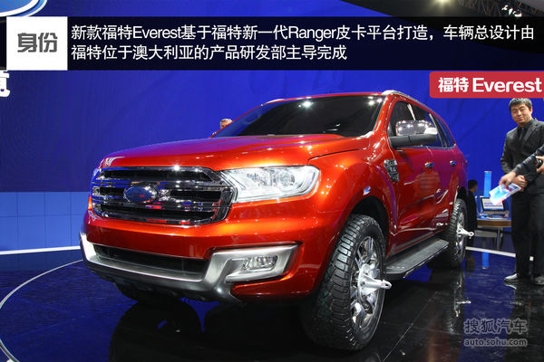 4月20日,2014年北京車展上福特Everest概念車正式發布。新車將在江鈴國產,而這款車即為江鈴內部代號為U375的SUV車型,將于2015年上市,預計售價25-45萬元。